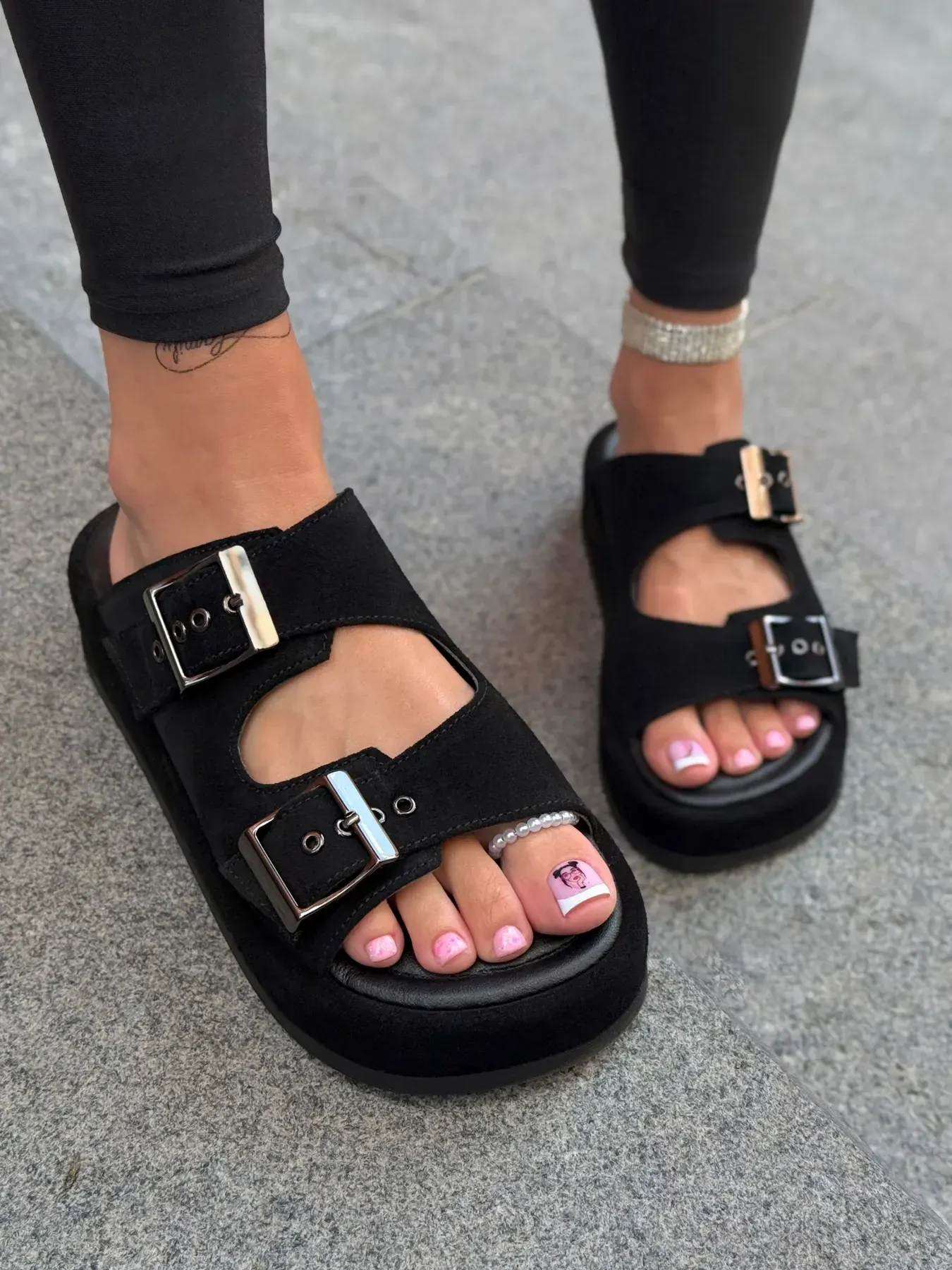 Black platform sandals with silver buckle